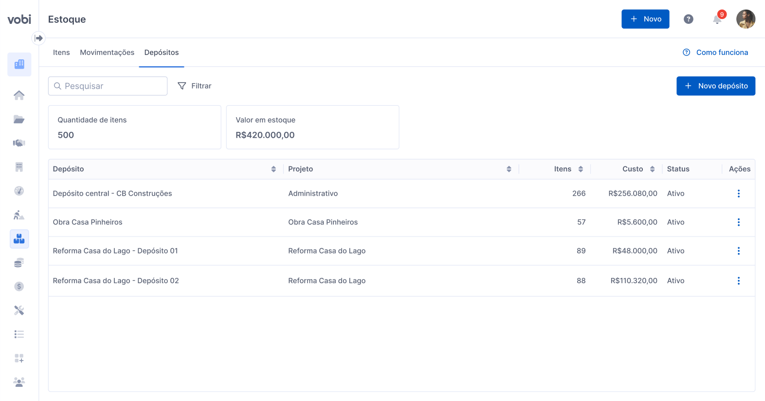 Aqui você vê e administra os depósitos (central e por obra), com indicadores de quantidade e valor total do estoque naquele conjunto de filtros.