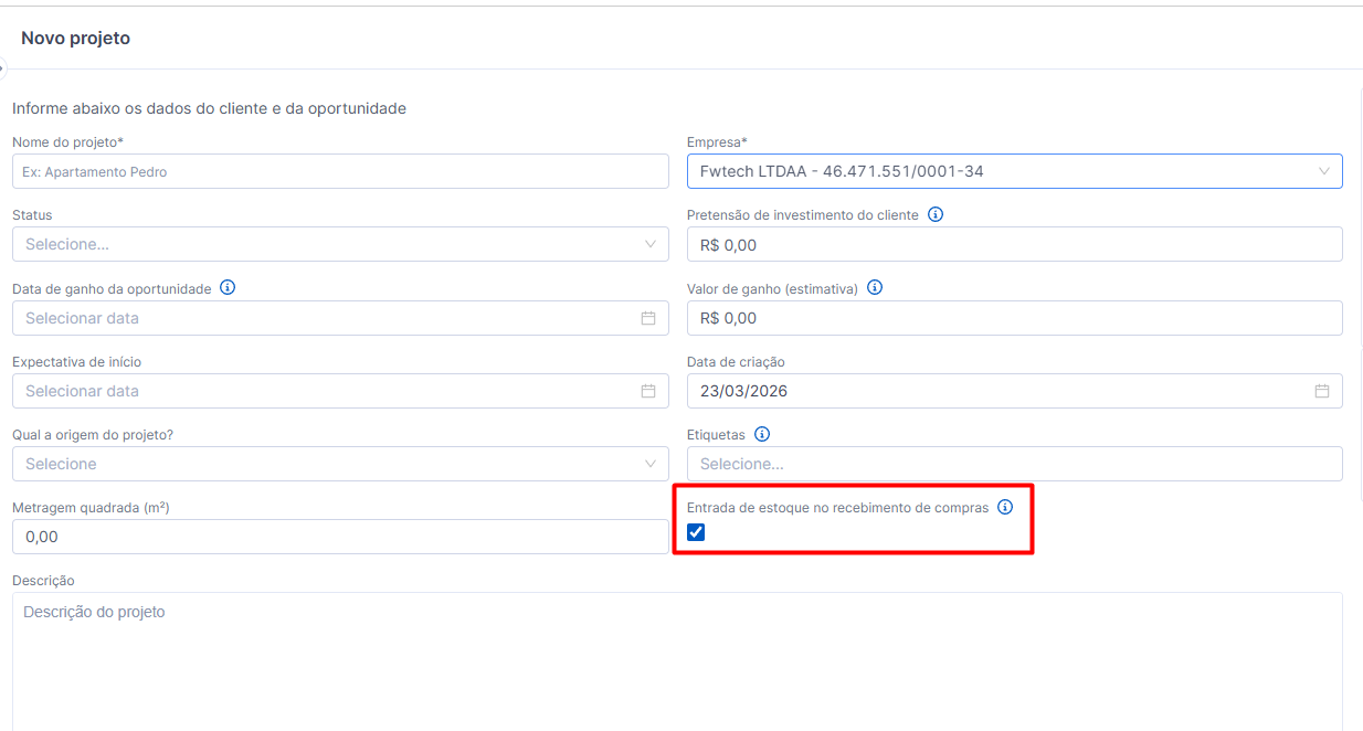 Quando a configuração “Entrada de estoque no recebimento de compras” está ativa dentro do projeto, o recebimento de uma Ordem de Compra passa a registrar Entrada no estoque (vinculada à OC).