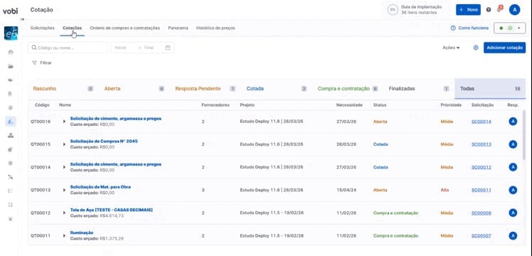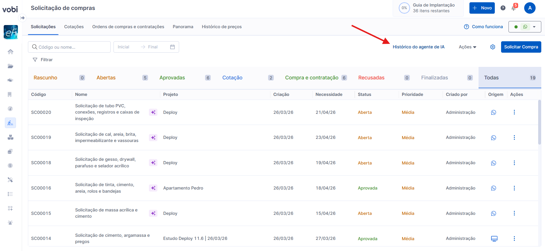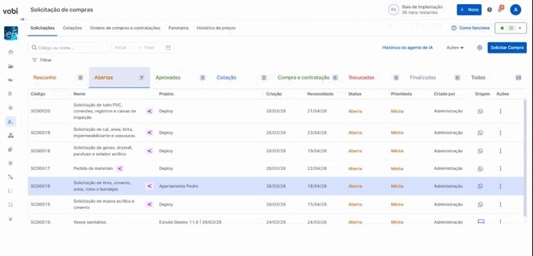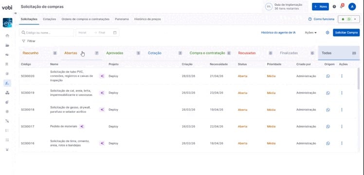 Ao receber os dados da solicitação, ela será criada automaticamente na Vobi, na página de Solicitações de Compras, com o status Aberta.