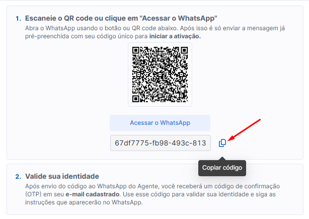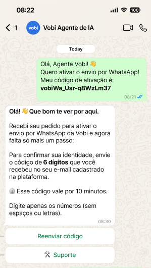 Ao acessar via QR code ou link, o código de ativação será enviado automaticamente na conversa.
