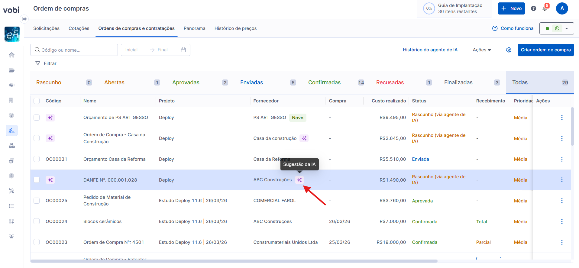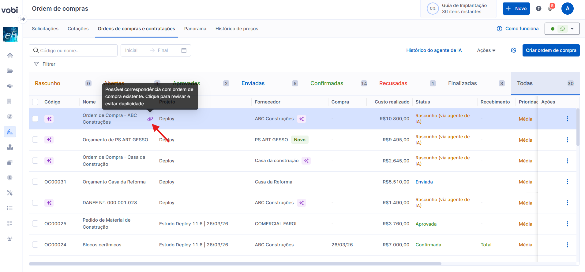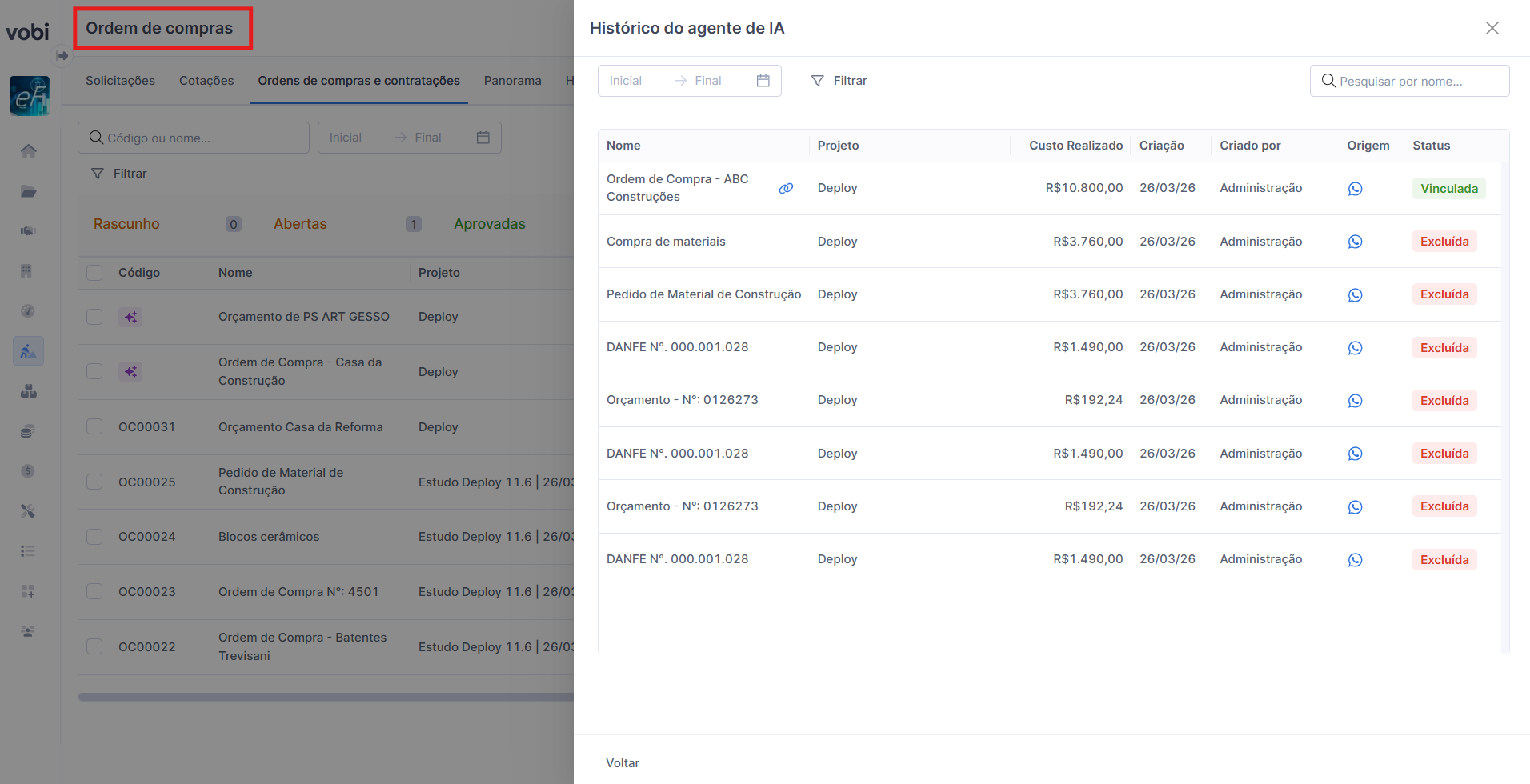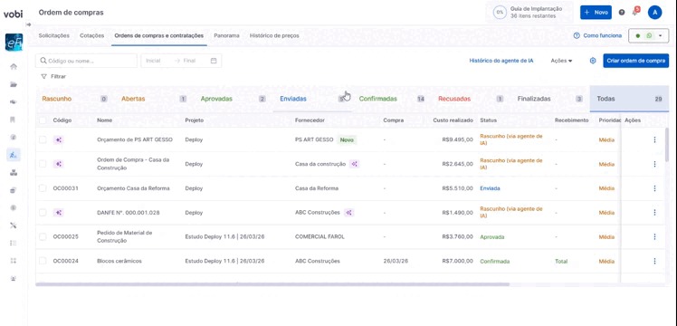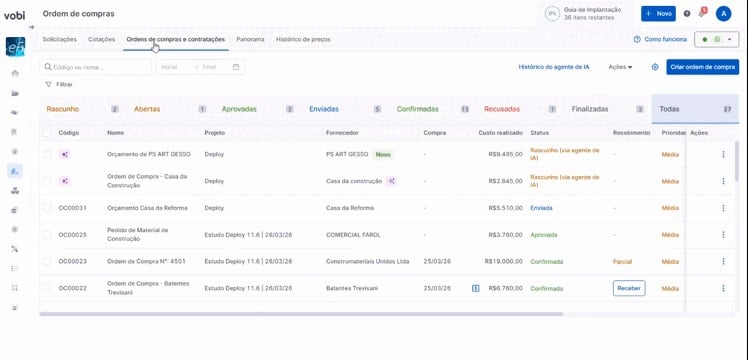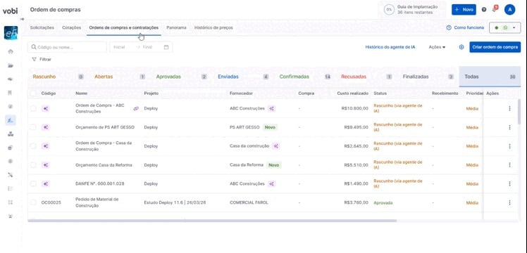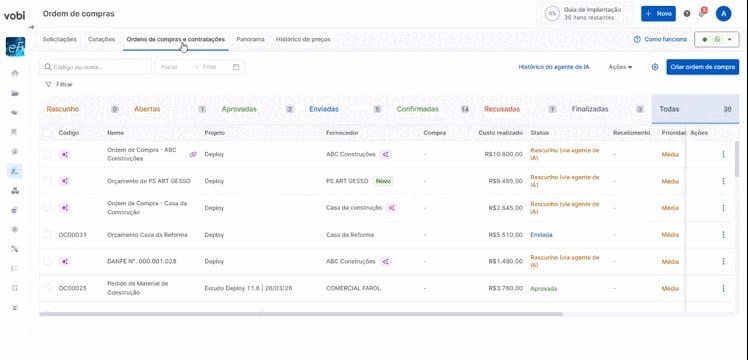 Ao receber os dados da ordem de compra, ela será criada automaticamente na Vobi, na página de Ordens de Compra, com o status Rascunho (via agente de IA). Nesse momento, o rascunho ainda não possui um código, pois precisa passar pela etapa de revisão.