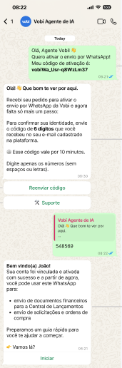 Após concluir o envio das informações pelo WhatsApp, o processo continua dentro da Vobi. Você poderá: