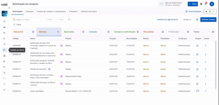 Gerenciar o processo de compras da sua obra pode ser muito mais simples, rápido e organizado com o Agente de IA para Suprimentos da Vobi.