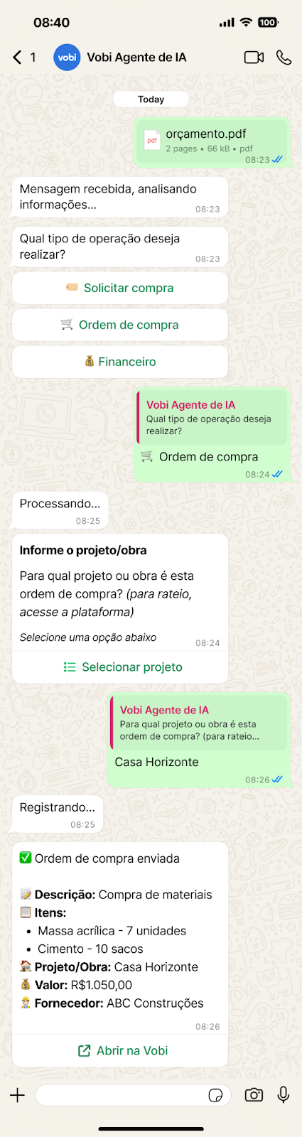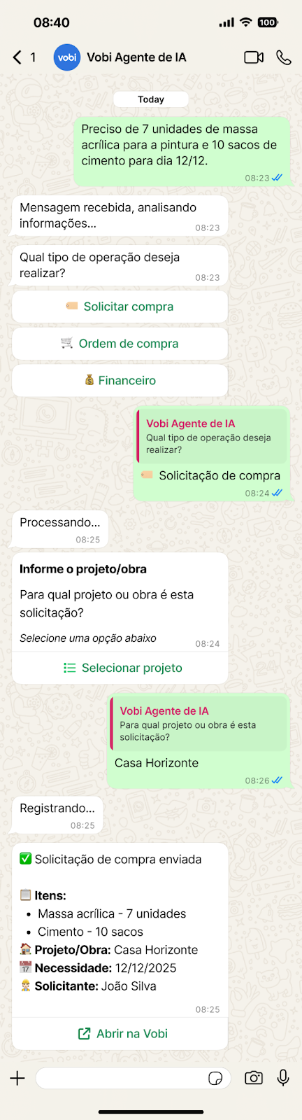 A partir disso, ele conduz todo o passo a passo, coletando as informações necessárias para registrar a solicitação ou ordem de compra de forma estruturada dentro da Vobi.