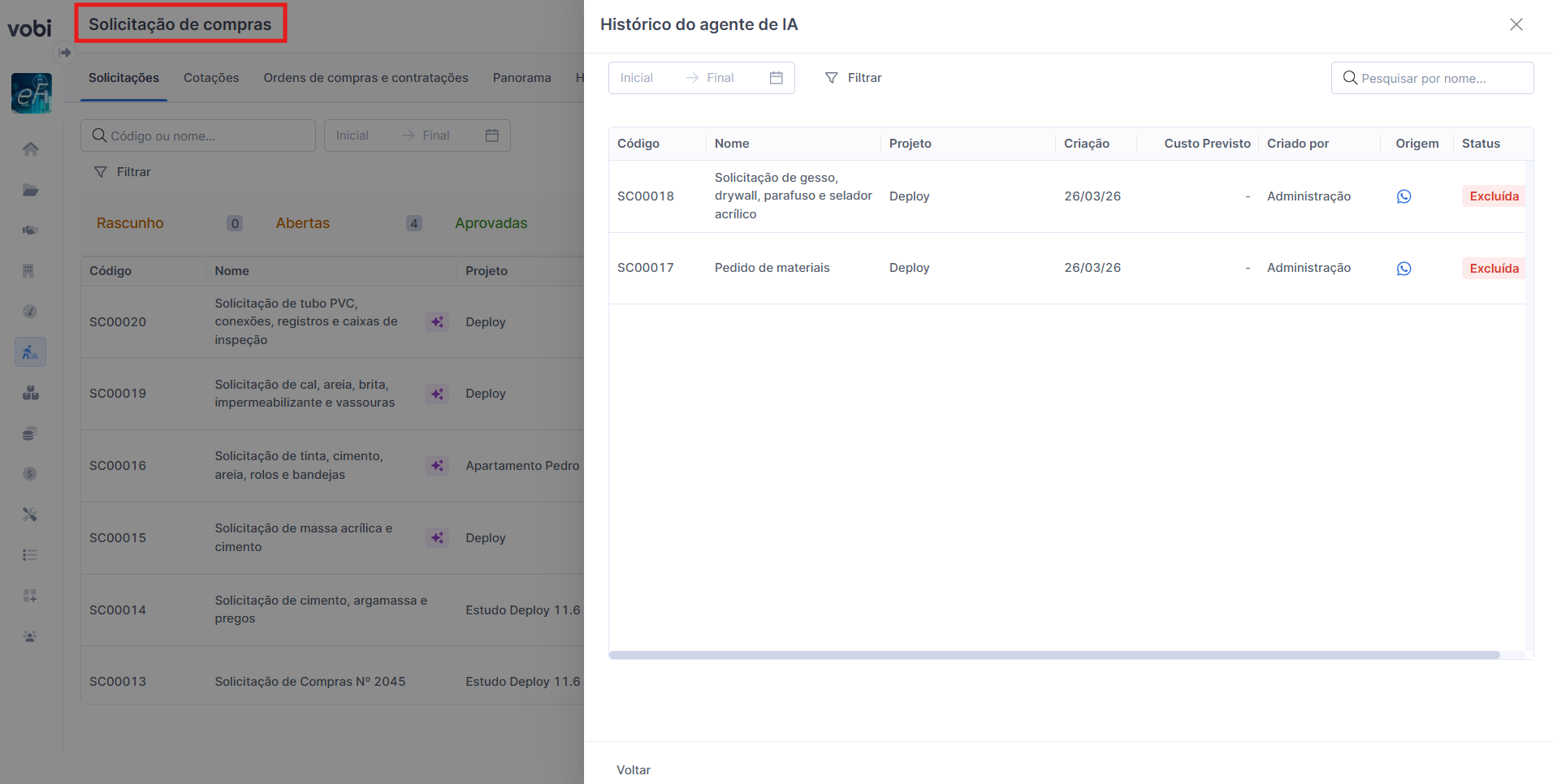 A plataforma conta com um histórico do agente de IA, onde você pode consultar os registros que não seguiram para criação direta de uma solicitação ou ordem de compra.