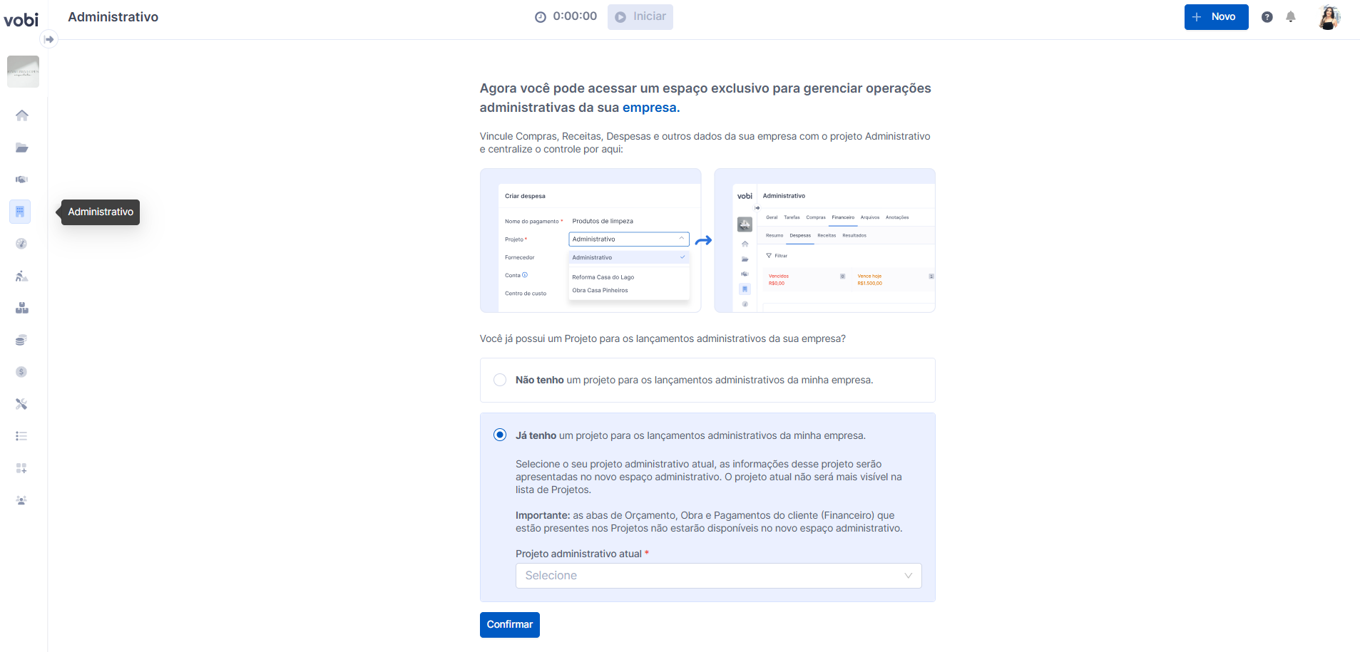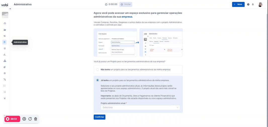 Se você já utilizava um projeto para controlar informações administrativas, é possível selecioná-lo e migrar esses dados para a aba Administrativo.
