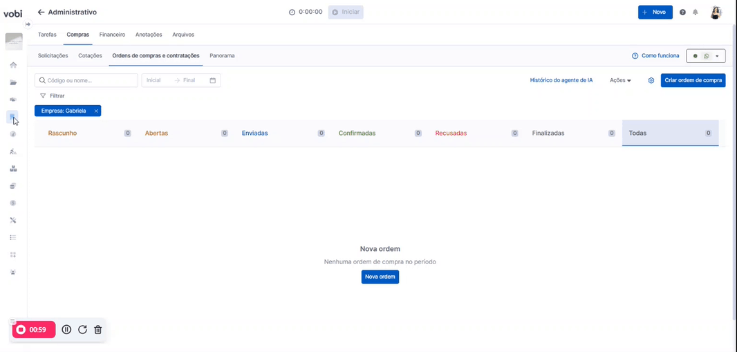 Na aba de Compras, você pode gerenciar todas as demandas relacionadas à operação interna da sua empresa, como: