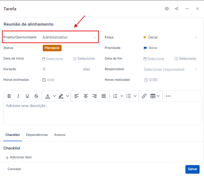 Ao criar uma tarefa, você conseguirá identificar que ela pertence ao Administrativo através do campo Projeto/Oportunidade, que estará definido como Administrativo.