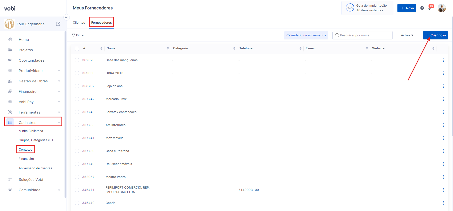Você pode criar fornecedores diretamente pela aba de Orçamento que fica dentro do projeto. Uma vez que ele for criado no orçamento, aparecerá automaticamente no menu Contatos (clientes e fornecedores) para que você preencha o restante das informações.