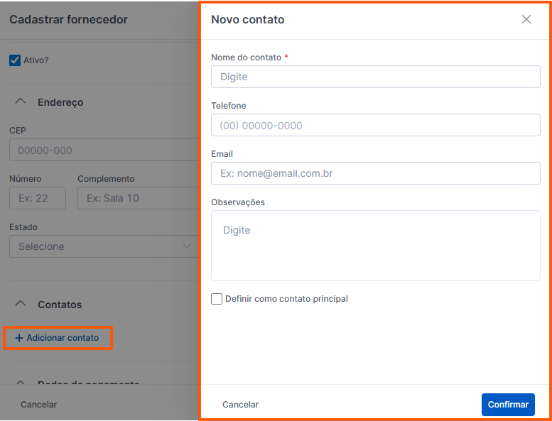 5. Adicione os contatos relevantes desse fornecedor (nome, telefone, e‑mail, observação) e defina qual dos contatos é o principal.
