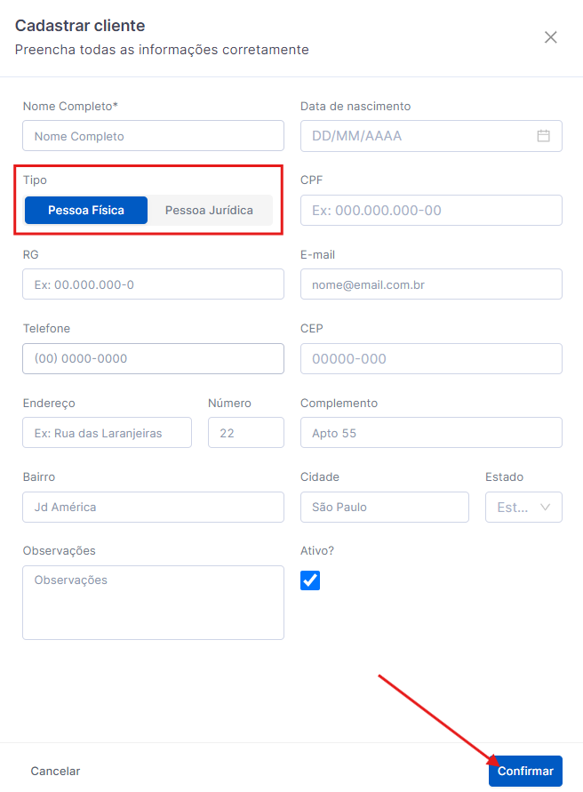 4. Clique em Confirmar para salvar o cadastro do cliente.
