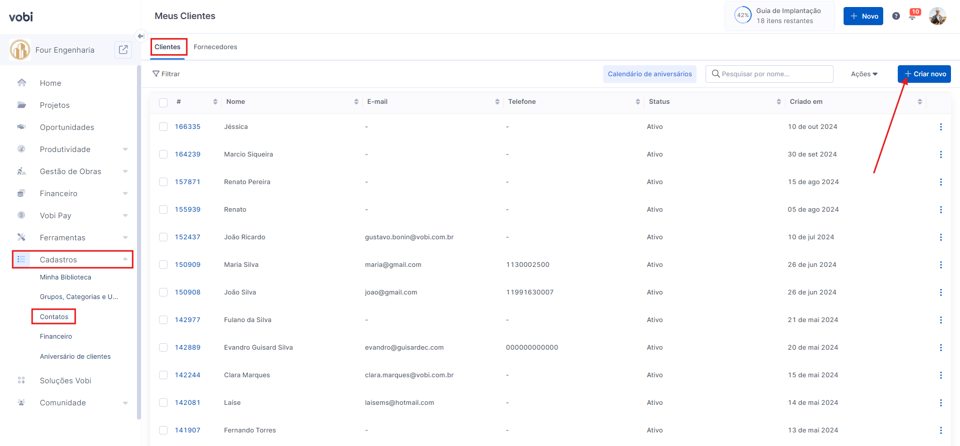 Para facilitar sua gestão, a Vobi oferece uma seção dedicada onde você pode criar uma lista com todos os seus clientes e fornecedores.