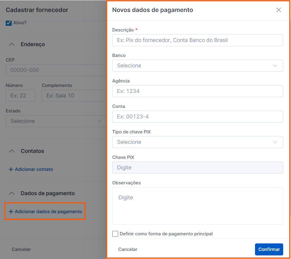 6. Adicione os dados de pagamento (chave PIX, banco, agência, conta) e defina qual será a principal.