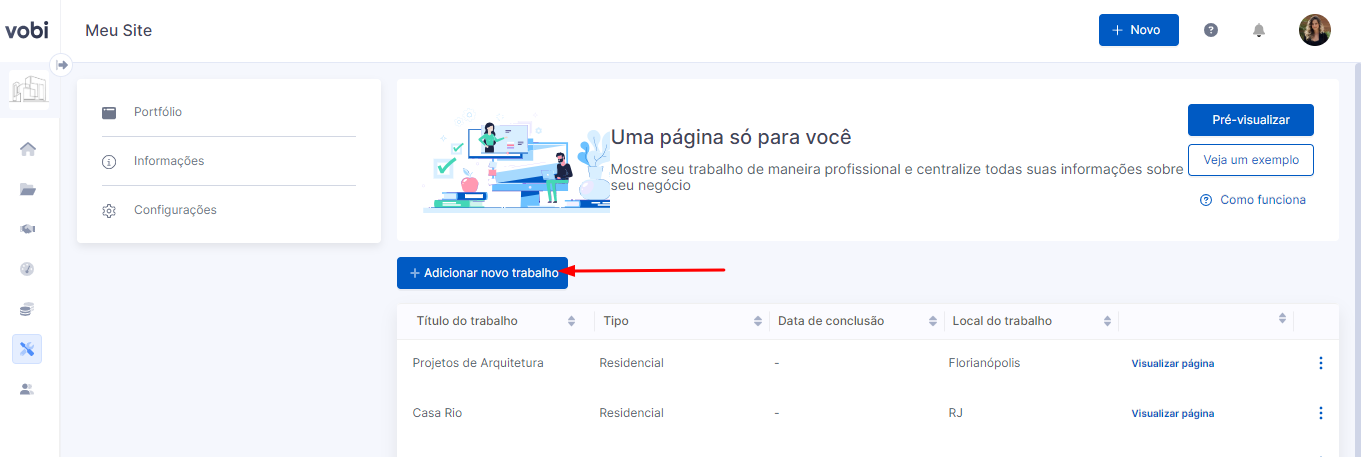 Você poderá acrescentar projetos e obras, editar suas informações e alterar o nome do seu portifólio a qualquer momento.