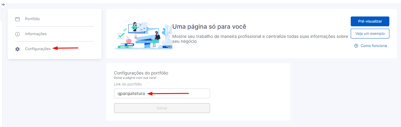 4. Na opção "Configurações" você poderá personalizar o link do seu portifólio com o nome que preferir. Basta escrever o seu nome ou da sua empresa e clicar em "Salvar".