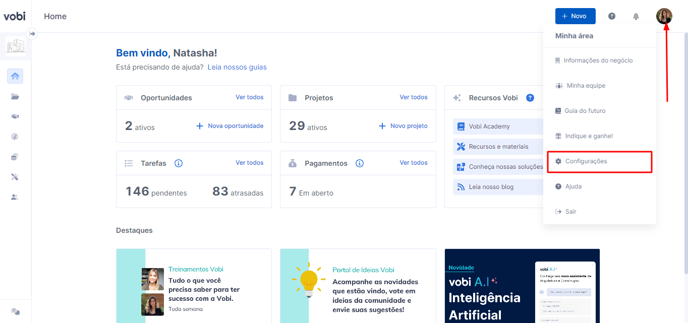 Após acessar a sua conta na plataforma, selecione o ícone no canto direito superior com a sua foto ou inicias do seu nome e depois clique em Configurações.