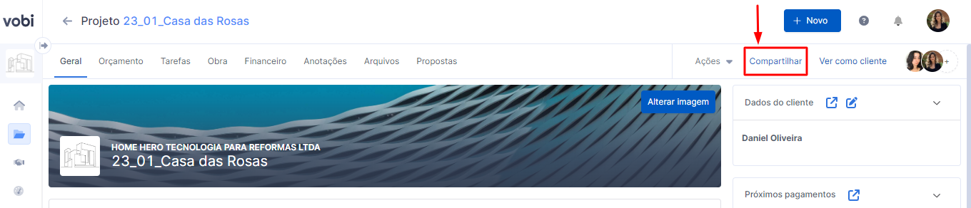 2. Clique no botão Compartilhar com cliente que aparece no canto direito superior da tela;
