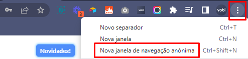 2. Abra uma janela anônima no seu navegador de internet clicando nos três pontinhos que aparecem no canto superior direito do seu navegador ou digite Ctrl + Shift + N;