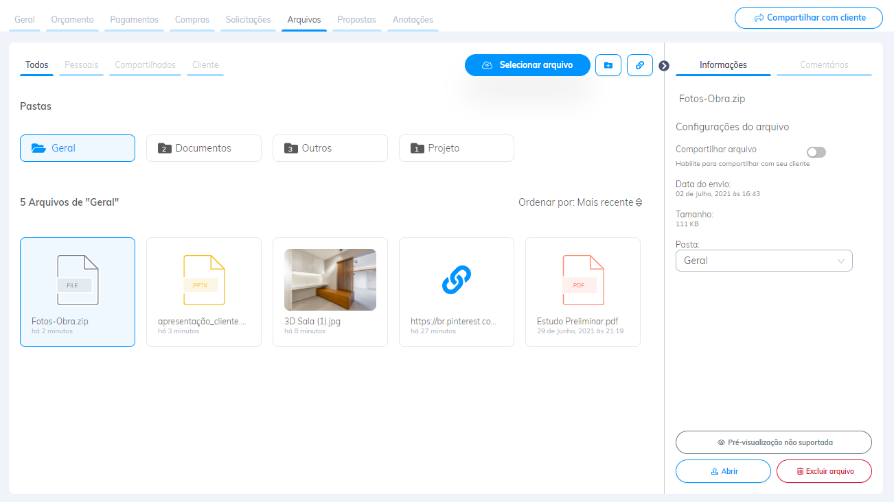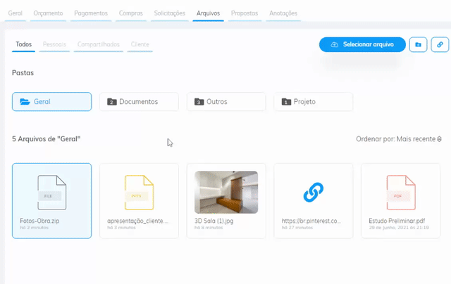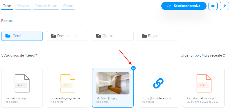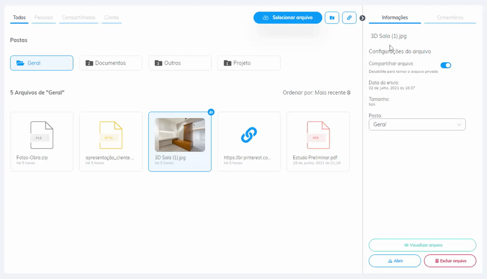 Agora você não precisa mais clicar em arquivo por arquivo e ainda ficar abrindo um por um para ter certeza de que aquele é o certo a compartilhar com seu cliente! Ao passar o mouse em cima do nome ele aparecerá completo, além de agora mostrarmos uma prévia da imagem, quando possível.