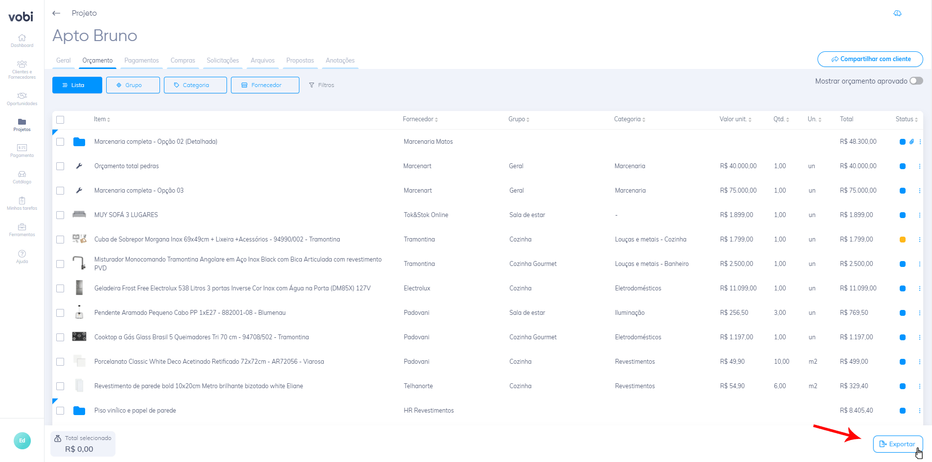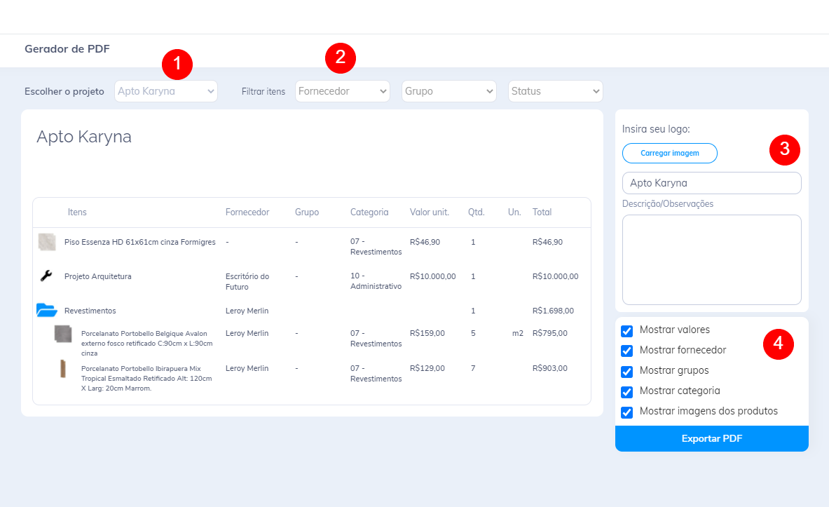 1. Projeto: Aqui você irá escolher qual o projeto que o orçamento será exibido