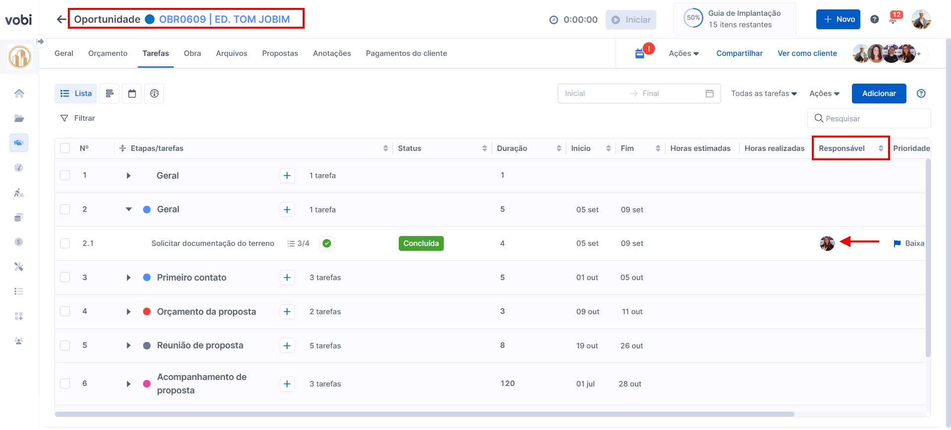 Além de definir responsáveis por tarefas individuais, você também poderá designar pessoas específicas da sua empresa como responsáveis por um projeto na Vobi!