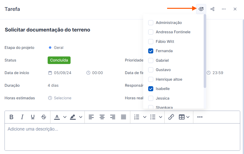 Atenção! Hoje nas tarefas você consegue inseri apenas um responsável por tarefa, de acordo com os colaboradores da sua Equipe - seja visitante ou membro. Mas caso haja outras pessoas envolvidas nessa tarefa, você pode adicioná-las como observadores.