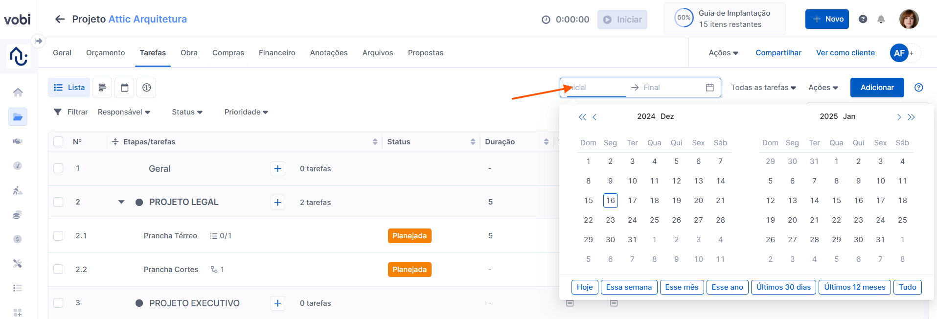 Além disso você pode ver somente as tarefas de período específico, podendo selecionar manual um intervalo de datas ou selecionar alguma das opções rápidas.