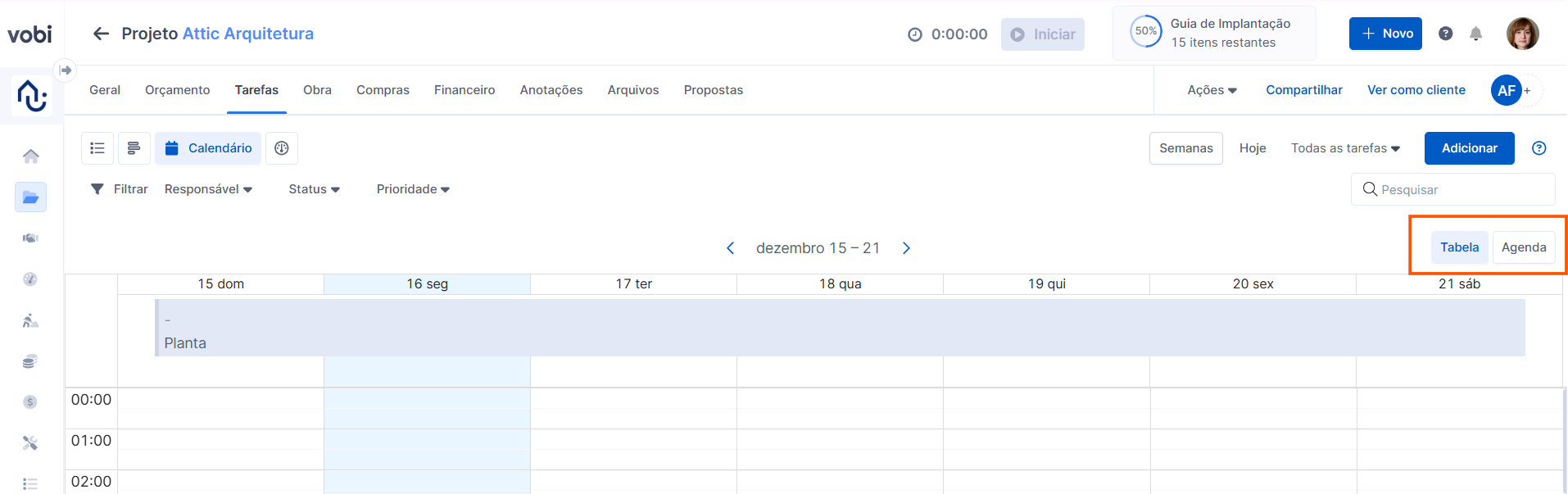 Para ter uma visualização completa das tarefas da semana em relação a um determinado projeto, por exemplo, basta em Tabela selecionar a visualização por semana.