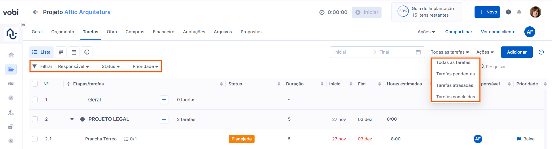 Na aba de tarefas do projeto você pode filtrar por: Responsável, Status e Prioridade.