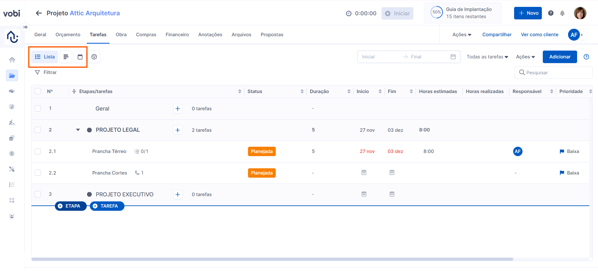 Esse conjunto de informações poderá ser visualizado na plataforma em forma de Lista, Gráfico de Gantt e Calendário.