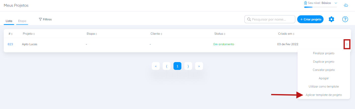 Para fazer tal ação, vá até o menu Projetos e depois clique nos três pontinhos que ficam ao lado direito do projeto que você deseja editar. Selecione a opção Aplicar template de projeto.