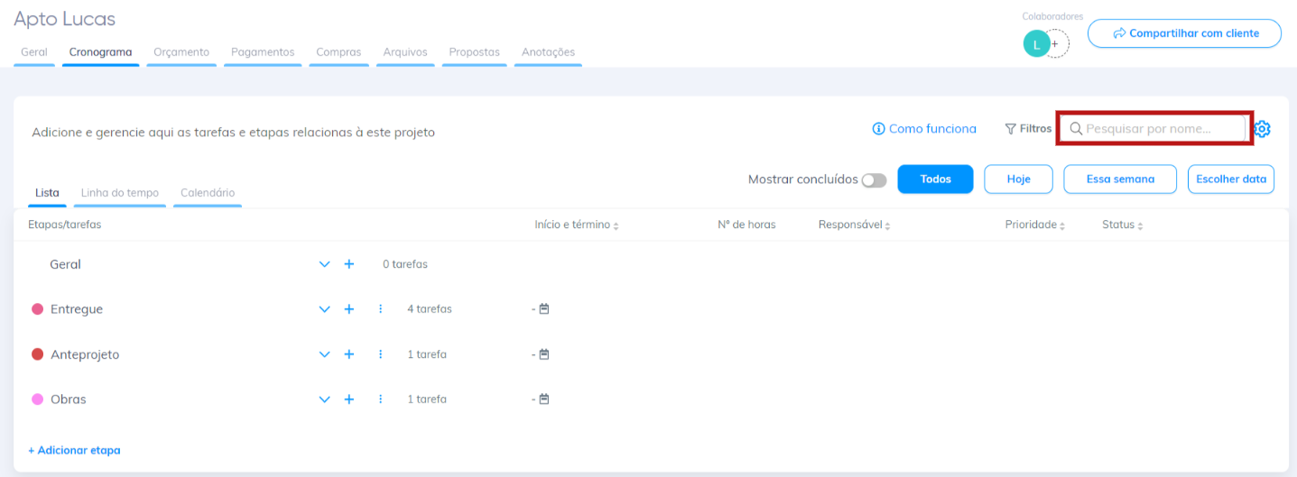 Pesquisar tarefa e itens de orçamento através do nome: encontre rapidamente tarefas e itens de orçamento através da barra de pesquisa rápida que fica alocada no canto superior direito da tela.