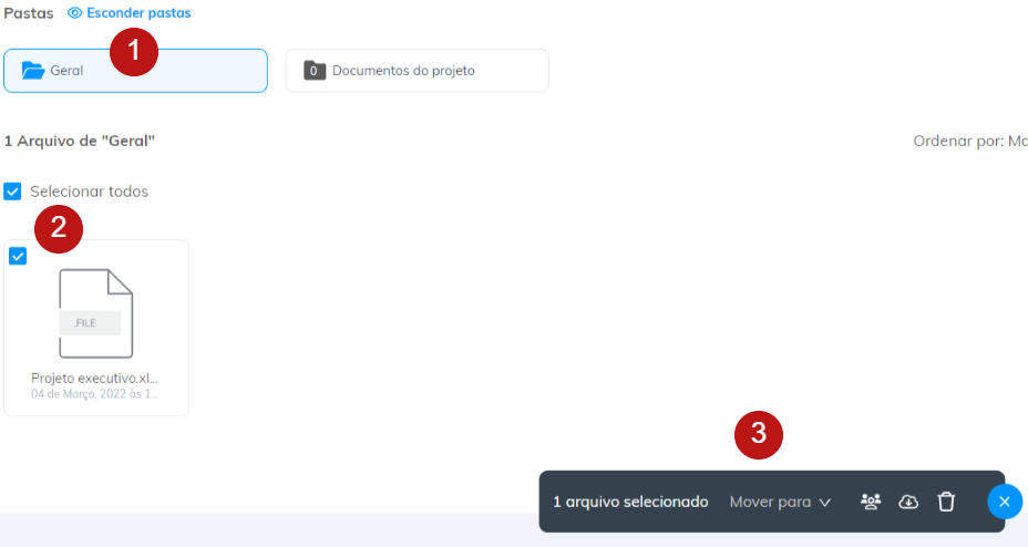 Menu de ações em massa: mova arquivos para pastas diferentes, compartilhe com seu cliente, baixe e exclua arquivos.