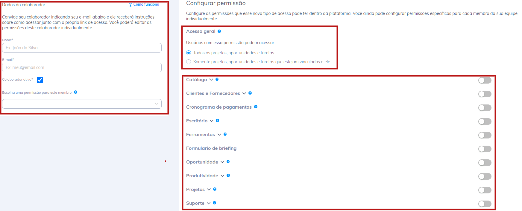 Só é necessário alocar o nome do colaborador + e-mail + permissões para criar a conta dele.