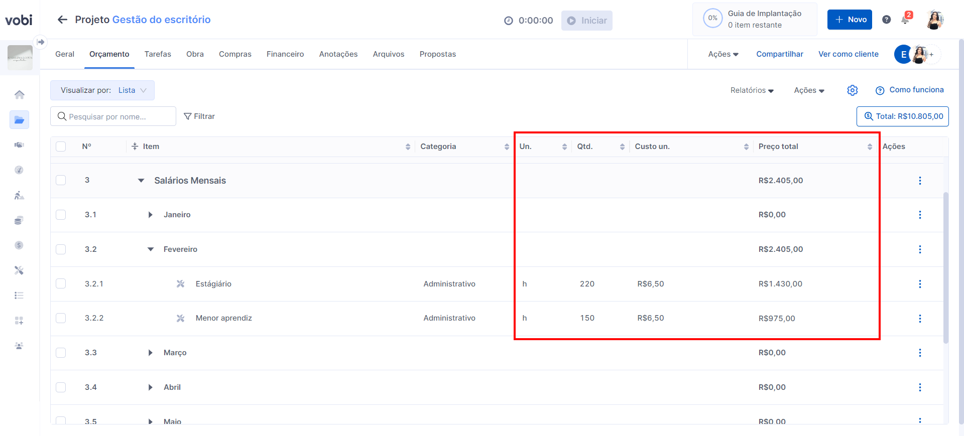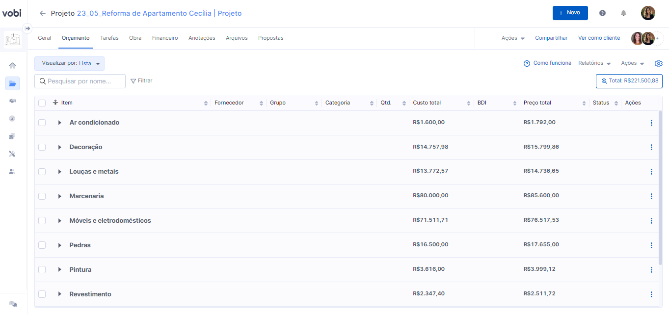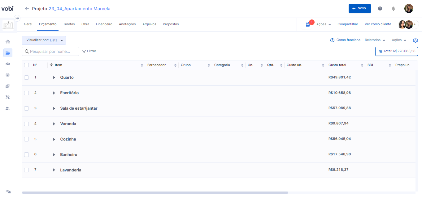 Dica da Vobi: É importante lembrar que além dessa organização em níveis, temos outras visualizações do orçamento: Grupos, Categorias e fornecedores. Basta preencher os respetivos campos dos itens e você pode apenas reorganizar o orçamento pela visualização. Entenda melhor como funciona essa configuração do orçamento AQUI!