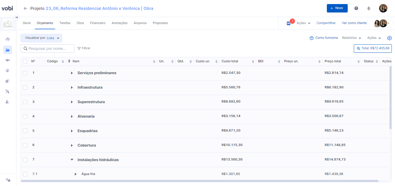 Ideal para obras públicas ou licitações, onde os valores oficiais são exigidos, você pode montar seu orçamento na Vobi utilizando a base SINAPI.