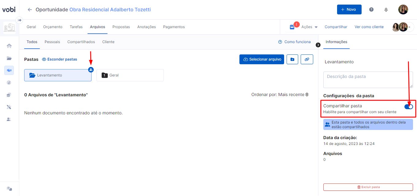 Durante essa fase, caso queira compartilhar pelo Portal do cliente alguma pasta ou arquivo, basta selecionar o que deseja e habilitar o acesso através do ícone de Compartilhar pasta ou Compartilhar arquivo.