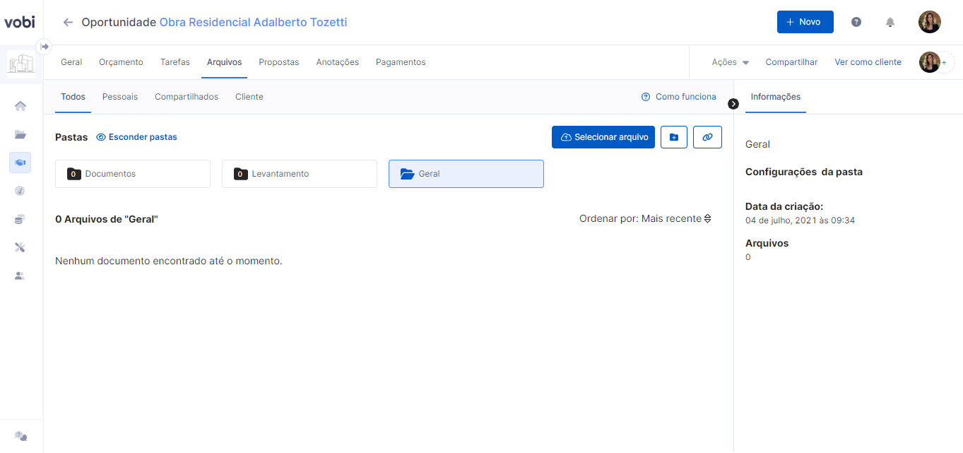 Com a possibilidade de um novo cliente, a aba arquivos irá te auxiliar no armazenamento de levantamentos de projetos, documentos e dados básicos que serão usados como referência nessa fase de estudo do serviço.