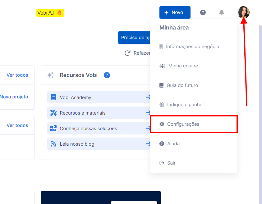 1. No topo direito da página, vá até o ícone com a sua foto ou com as iniciais do seu nome - caso não tenha adicionado uma imagem; e depois na opção Configurações.