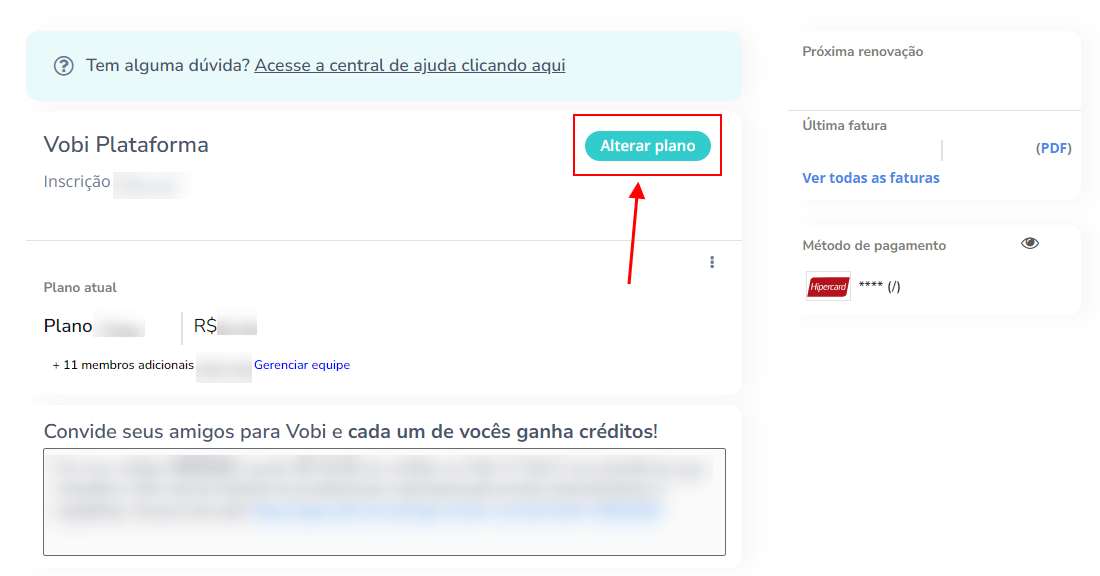 3. Dentro de Assinatura Geral, clique no botão Alterar Plano e selecione o novo plano que deseja migrar!