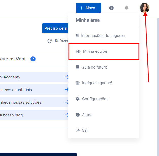 1. No topo direito da página, vá até o ícone com a sua foto ou com as iniciais do seu nome - caso não tenha adicionado uma imagem; e depois na opção Minha equipe.