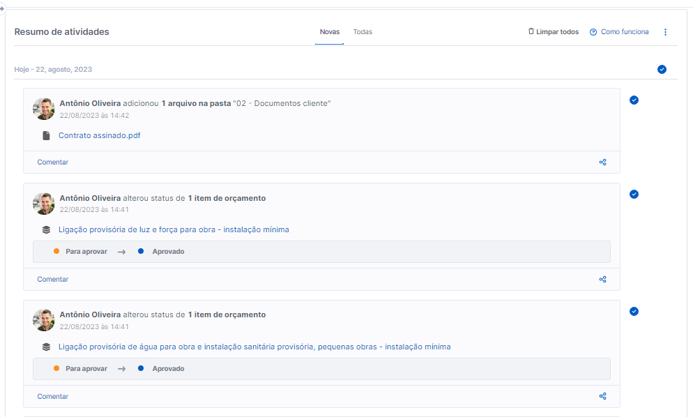 Aqui constam as últimas ações do seu cliente e da sua equipe no projeto, relacionadas a: