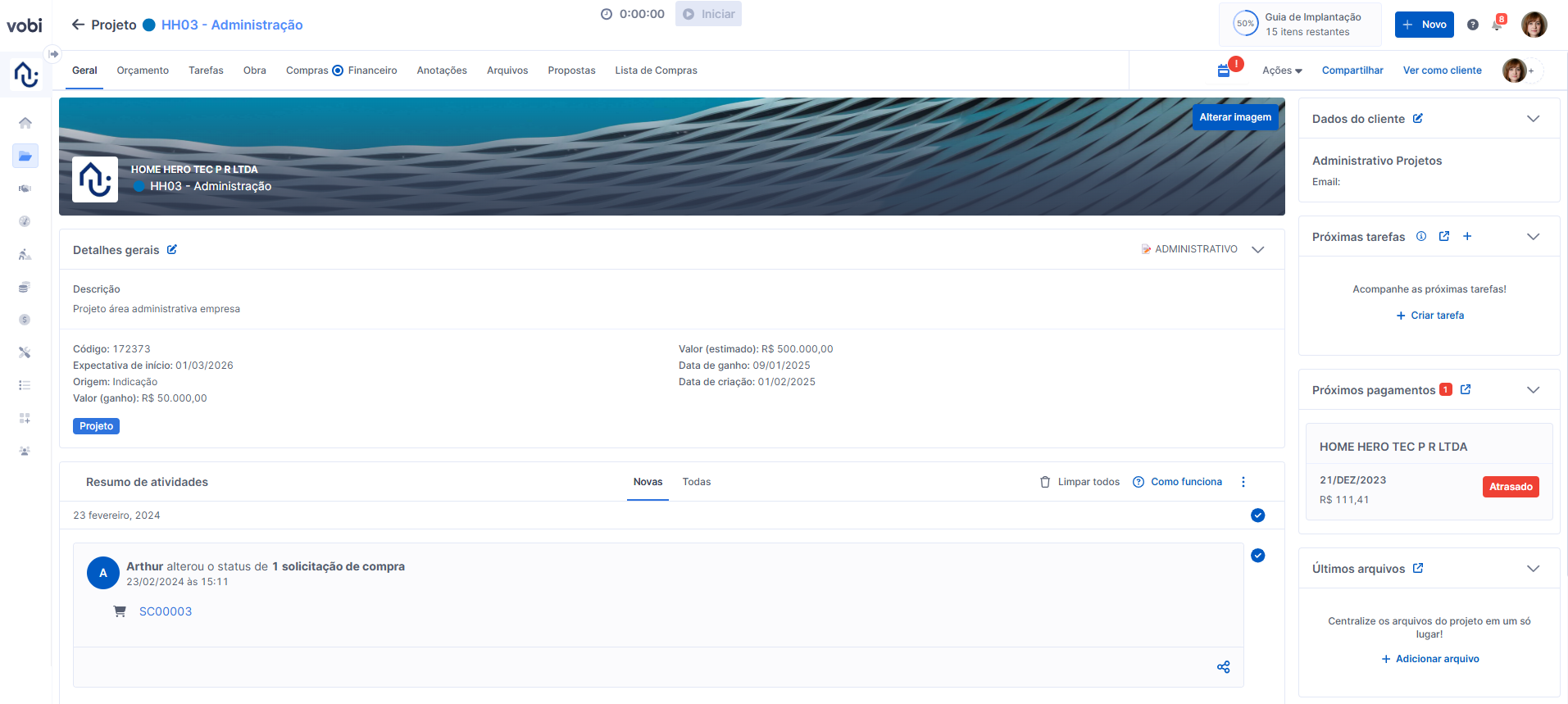 Para tornar a experiência com a Vobi mais fluida e intuitiva, a aba Geral apresenta um resumo das atividades mais importantes, para que você e seu cliente não percam nenhum detalhe ao longo do projeto!