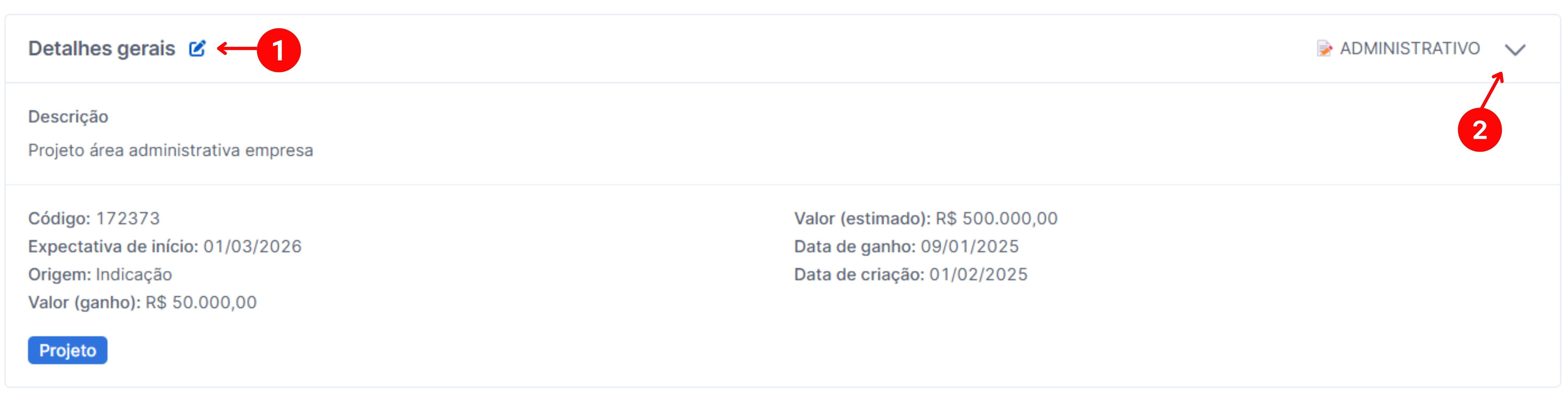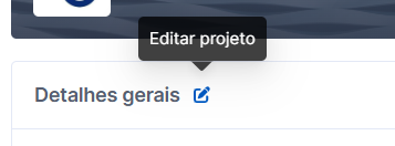 Para editar os dados do projeto você pode ir pelo ícone de lápis (1) e para trocar o status do projeto basta ir pela setinha(2).