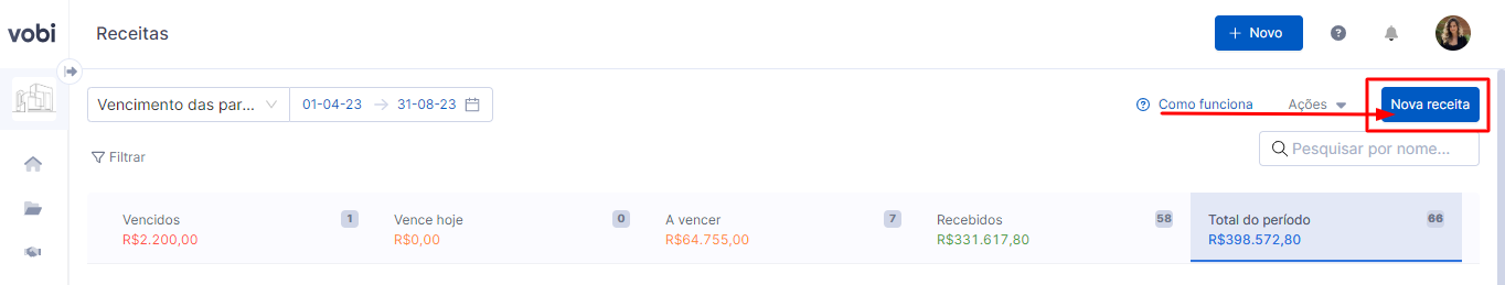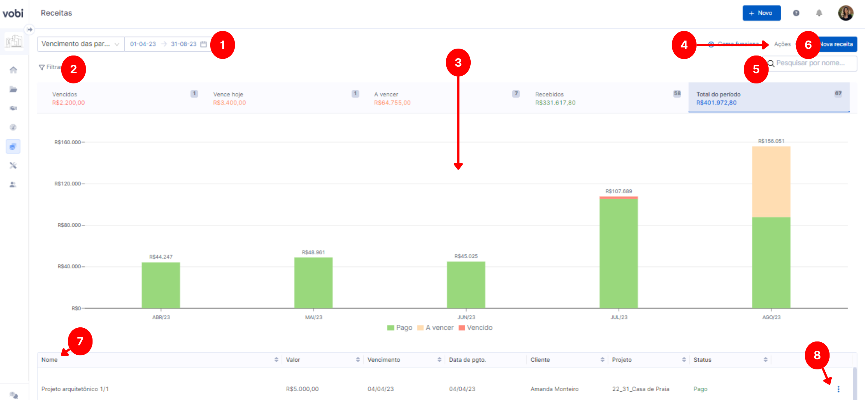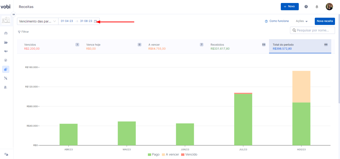 Ver gráficos específicos das parcelas nos filtros de apoio, como: Vencidos, Vence hoje, A vencer, Recebidos e Total do período - conforme indicado na imagem a seguir