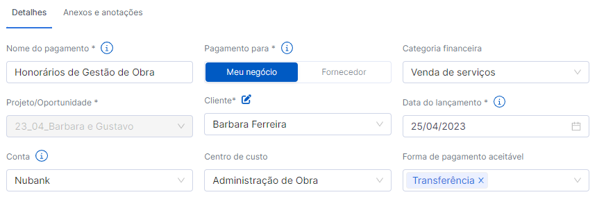 Pagamento: Feito por um cliente e ligado a um projeto ou oportunidade na Vobi, como quando um cliente paga por um serviço contratado, como a taxa de administração de obra.