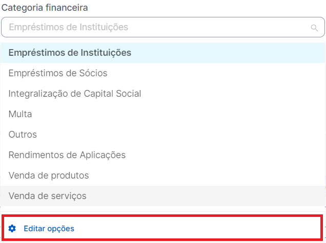 Categoria financeira: você pode selecionar uma das categorias que já deixamos configuradas, além disso, você também pode criar a sua própria categoria se desejar.
