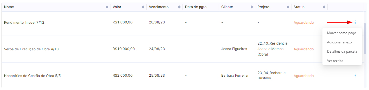 8. Ícone de três pontinhos - use esse ícone para adicionar anexos, alterar o status da parcela ou para ver a receita inteira.