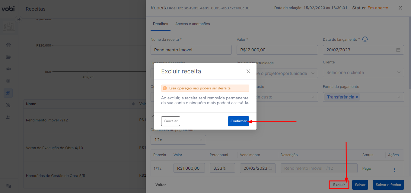 E caso você precise excluir essa receita, clique em Ver receita e em seguida, selecione a opção Excluir no final da tela e confirme a ação, mas lembre-se que essa ação é permanente.