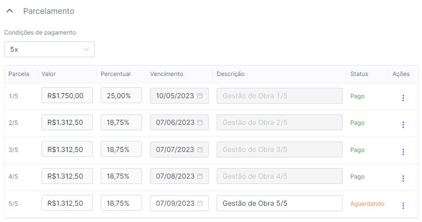 Por padrão, as parcelas possuem um intervalo de 30 dias corridos entre uma e outra, mas você poderá remanejar essas datas se necessário. Além disso, poderá também definir o percentual do valor total inserido que essa parcela se refere.
